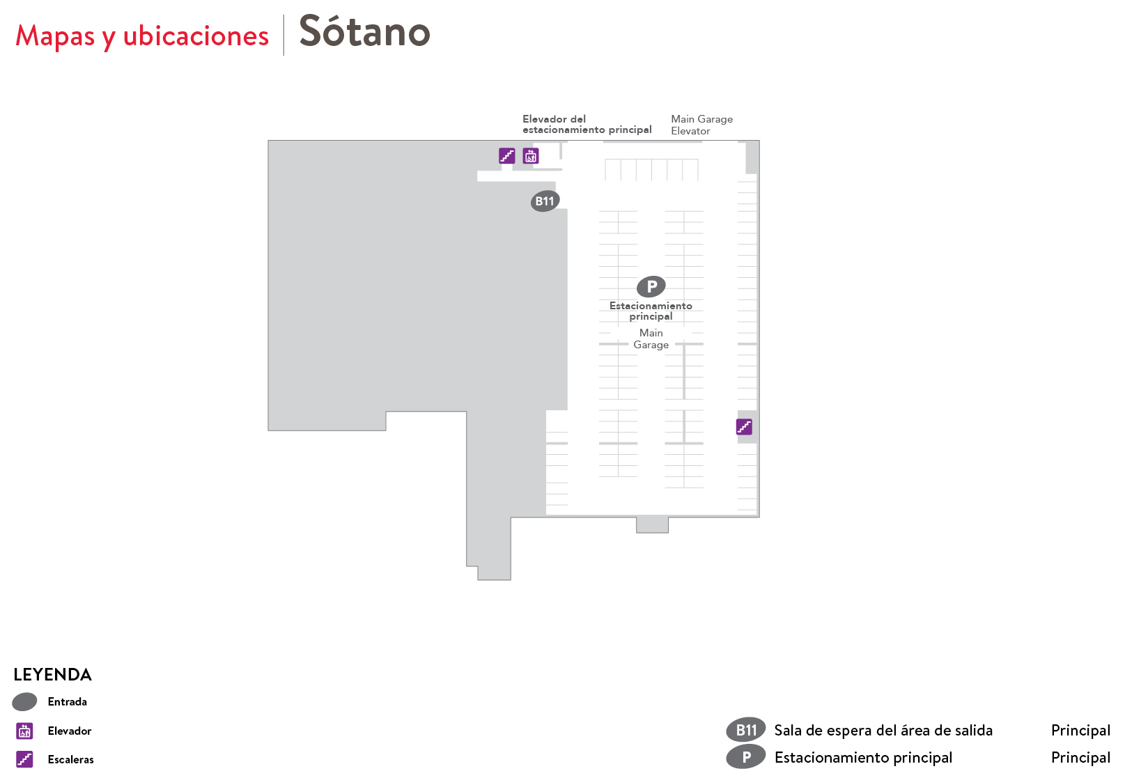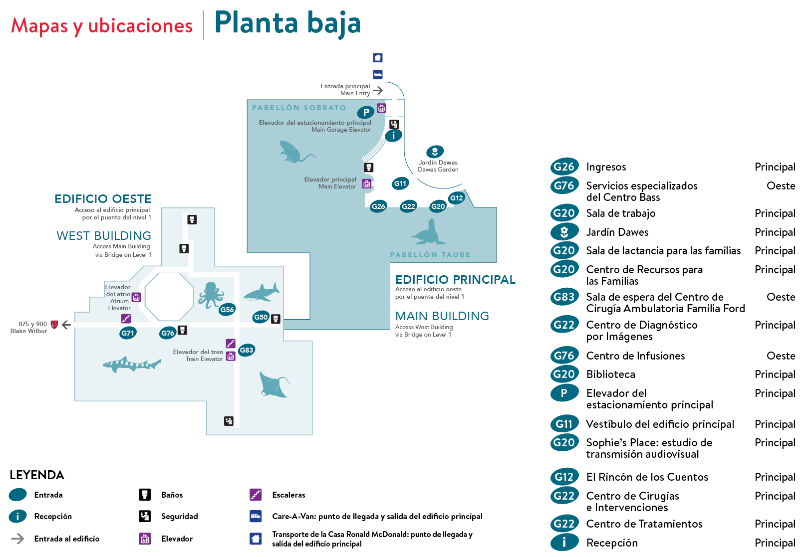 El estacionamiento del edificio principal es para nuestras familias y visitantes, y tiene espacios especiales con estaciones de carga para vehículos eléctricos. Los visitantes pueden dejar su automóvil en la cabina del valet en la entrada principal y recogerlo en el sector de salidas (Departure Lounge). El sector de salidas está abierto de lunes a viernes de 8 a.m. a 4:30 p.m., y también es un lugar para recoger personas designado para el transporte de Care-A-Van y la Casa Ronald McDonald.